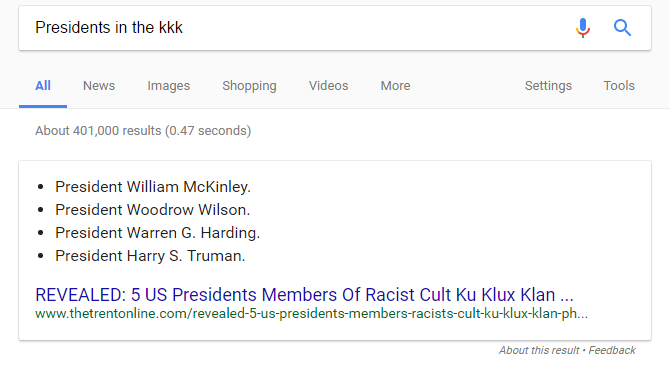 Take for instance this search, where we ask Google which presidents were in the Ku Klux Klan. The Google panel provides what seems to be a definitive answer: there were five!