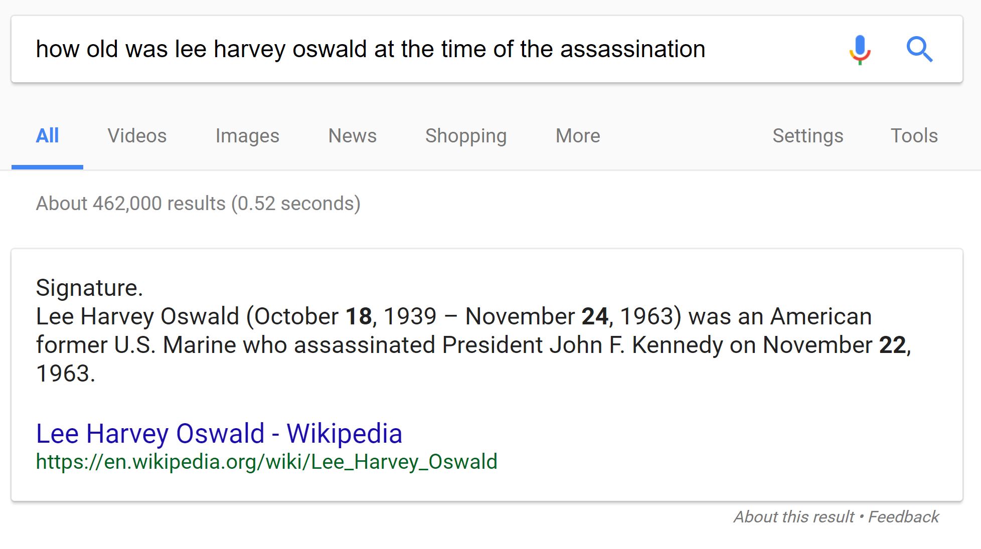 Google uses some programming to try and highlight relevant answers in the blurb, but the highlighting is confused or confusing. Here, Google, when asked how old Lee Harvey Oswald was when he shot Kennedy, highlights 18, 24, and 22.